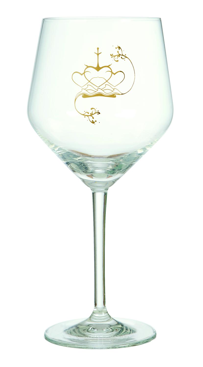 Kärleksgåvan: Rödvinsglas i modern design med ett kärleksemblem som har skapats av den unga, internationellt erkända konstnären Rikke Jørgensen.